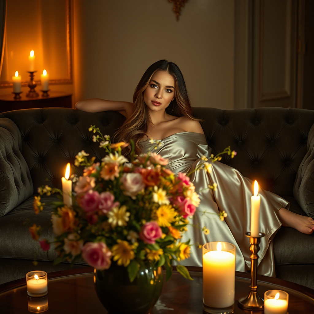 Epic portrait of a stunning woman reclining on a luxurious velvet sofa in a softly lit room, with the gentle glow of candles dancing around her. Her long, lustrous hair flows gracefully down her back, shimmering in the dim light. She is draped in an elegant silk gown, the material catching the candlelight in a mesmerizing way. A vase overflowing with freshly picked flowers adorns the coffee table before her, infusing the room with a delightful aroma. The ambiance exudes a serene and enchanting allure, capturing the essence of timeless beauty and tranquility.
