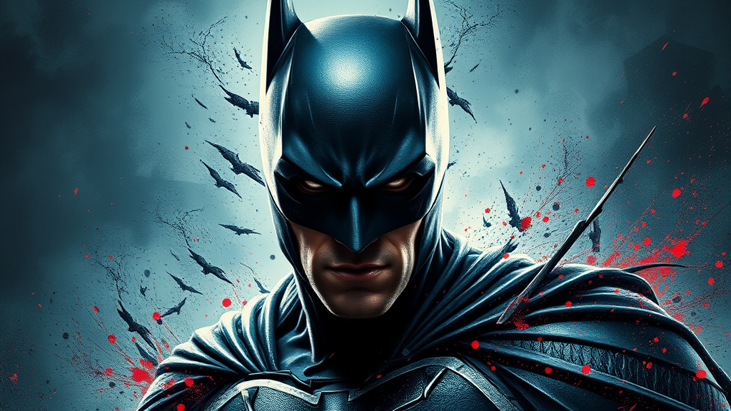 Epic portrait of Batman, inspired by Artstation trends, featuring dynamic splash paint splatter, sharp focus like a studio photograph, with intricate and complex details. Drawing inspiration from artists like WLOP and Greg Rutkowski, the artwork emphasizes highly detailed and textured elements. The composition captures the enigmatic and heroic essence of Batman through a visually stunning and immersive depiction, maintaining the core aesthetic while adding a unique twist to the original concept.
