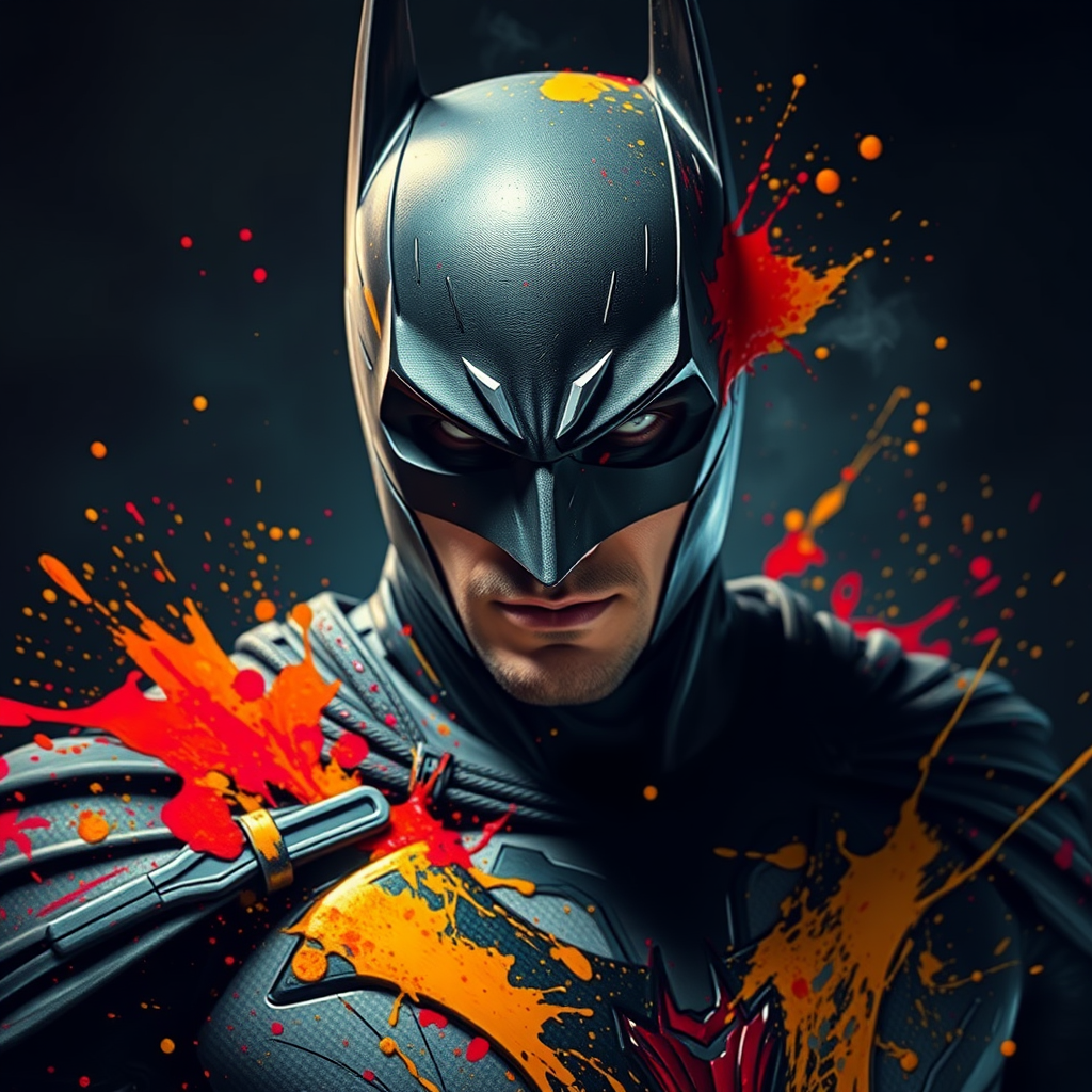Epic portrait of Batman trending on ArtStation, featuring dynamic splash paint effects, sharp focus, studio photography, intricate and highly detailed design, inspired by WLOP and Greg Rutkowski. The composition blends vivid paint splatters with a focus on Batman's iconic features, capturing a dramatic and intense atmosphere. The detailed artwork highlights Batman's gear and texture, creating a captivating image with an artistic flair reminiscent of top trending ArtStation pieces.