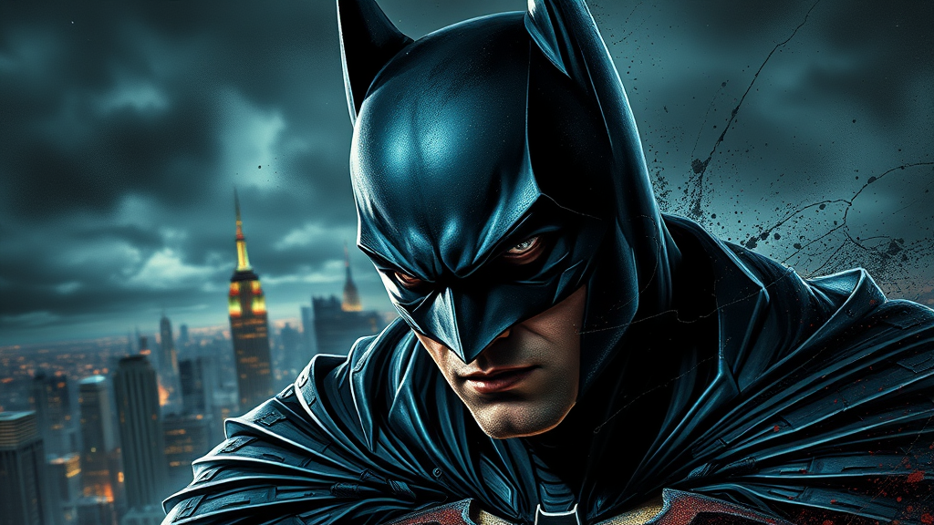 Epic portrait of Batman trending on ArtStation, with dynamic paint splatter elements, sharp focus, studio lighting, intricate and highly detailed, inspired by WLOP and Greg Rutkowski's styles. Add a dramatic background of a stormy Gotham skyline, glowing city lights in the distance, capturing the legendary intensity and mystery of the Dark Knight.