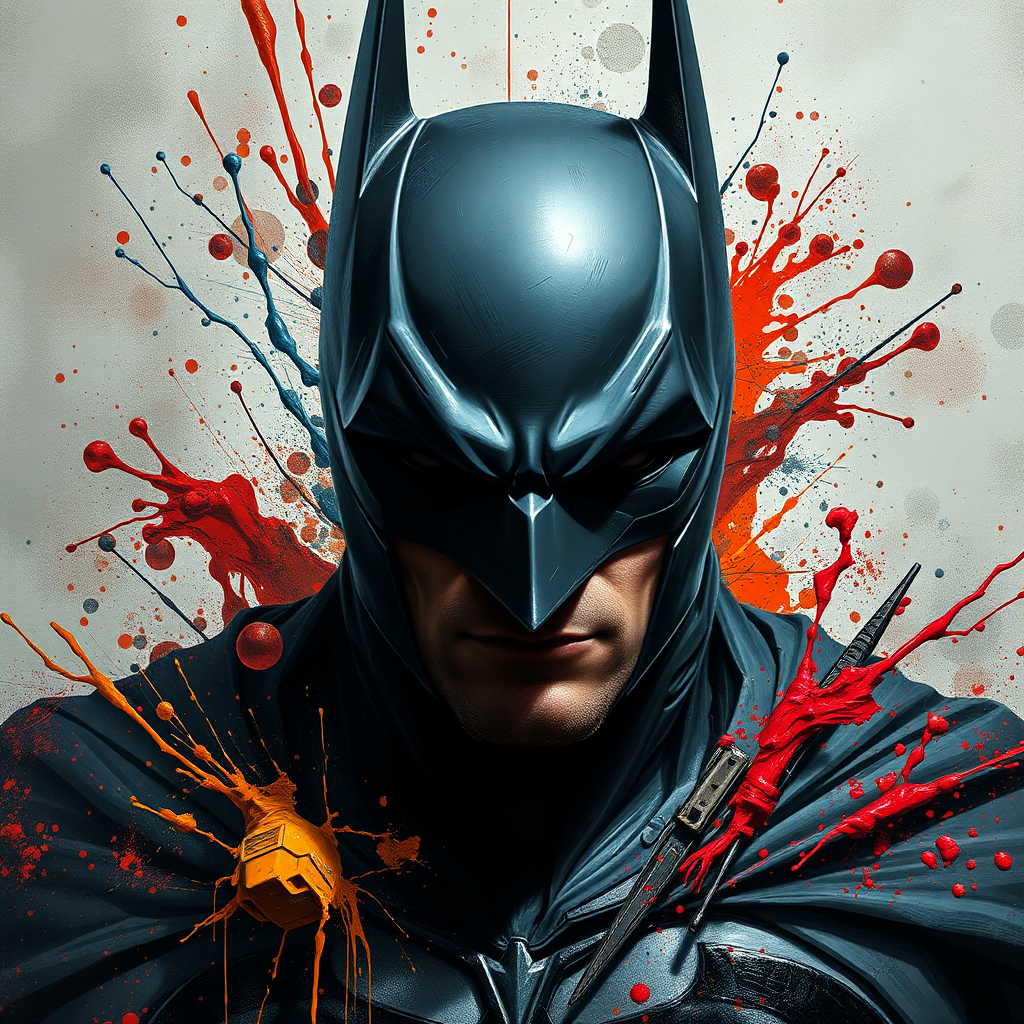 Epic portrait of Batman trending on ArtStation, featuring dynamic paint splashes and splatters, with a sharp focus, studio-quality lighting, and intricate details. Inspired by WLOP and Greg Rutkowski, the image showcases complex textures and elaborate elements, maintaining a high level of detail and clarity. The composition captures the essence of Batman with a modern artistic flair, combining both traditional and digital art influences seamlessly.