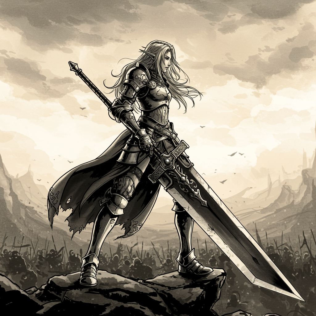 Epic scene of a fierce female warrior wielding a massive greatsword, depicted in a Final Fantasy-inspired ink style. She stands poised on a rocky cliff, her armor glinting in the dramatic, high-contrast lighting of a setting sun. The wide-angle perspective captures the expansive, battle-scarred landscape stretching into the distance, emphasizing her commanding presence. Her long hair flows with the wind, adding a dynamic element to the composition. The entire scene is rendered in stunning 4k detail, showcasing intricate designs and textures that blend fantasy with realism.
