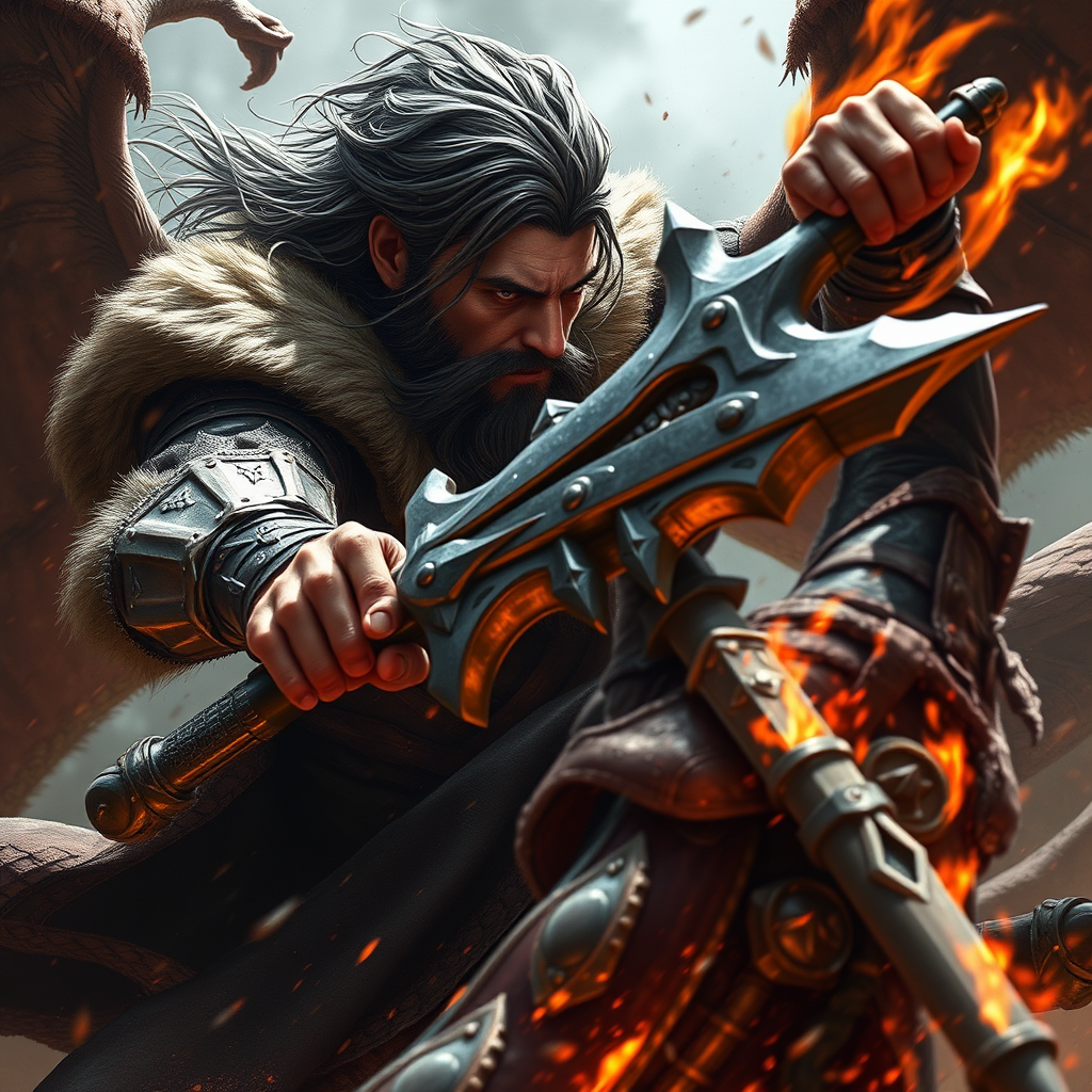 Epic scene of a full male figure engaged in intense combat, clashing with an adversary wielding a massive weapon. Focus on a male human with strong ties to Kaelan from Dragonlance, embodying a devout cleric role. Capture the essence of battle, featuring intricate details in the face and eyes. Achieve a masterpiece-level quality with photorealistic attributes, rendered in 8k resolution. Artists' influence includes Jeremy Mann, Sandra Chevrier, and Maciej Kuciara, ensuring a sharp, realistic depiction with authentic shadows and a 3D effect. Introduce subtle creative variations to emphasize the core theme, avoiding low-resolution, overly fantastical elements, and maintaining a serious tone.