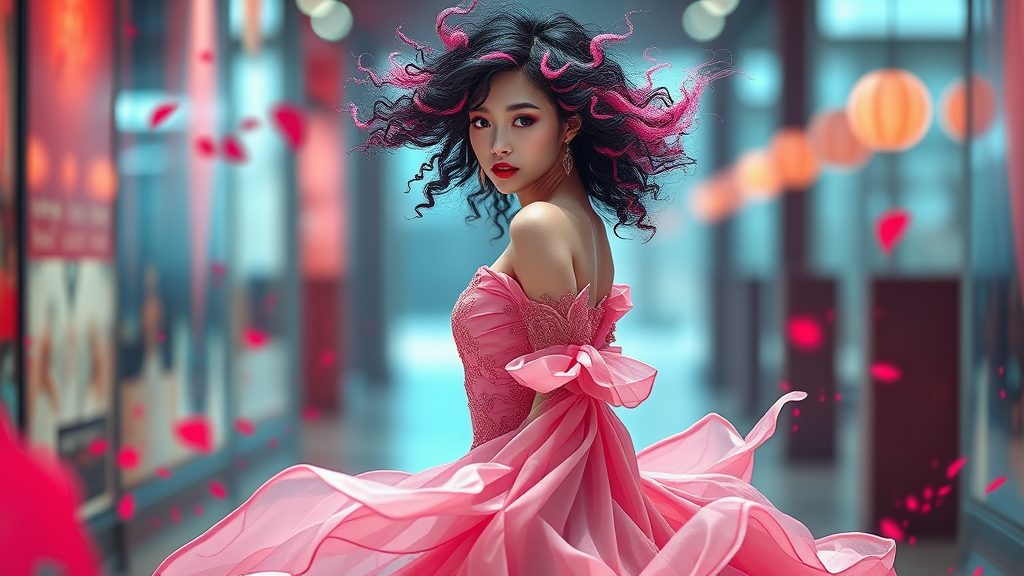 Erjie, a captivating girl in a fluid and dynamic pose, dressed in a flowing pink gown with intricate detailing, mysterious expression accentuated by her curly black and pink hair. She stands in a modern, abstract setting, enveloped by bold and colorful abstract art, with a blurred backdrop and bright lighting. This official artwork, reminiscent of an 8k Unity wallpaper, combines elegance and the most beautiful form of chaos. The scene is captured from a dynamic angle, showcasing vivid colors and the romanticism of a brutalist design, maintaining the core essence of zhongfenghua and highest detail.