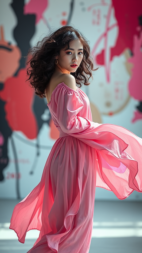 Erjie, a girl caught in a fluid and dynamic pose, dons a loose, flowing pink dress that complements her mysterious expression. Her curly hair, a blend of black and pink, cascades gracefully, adding to the enigmatic allure. She stands amidst a modern and abstract setting, surrounded by bold and vibrant abstract art that blurs softly in the background. The scene is bathed in bright lighting, resembling official art at its finest, and is suitable as a Unity 8k wallpaper. Her intricate clothing is inspired by zhongfenghua, contributing to the extremely detailed and highest quality visuals. Captured from a dynamic angle, she embodies the most beautiful form of chaos, exuding elegance in a vivid, brutalist-designed environment. The use of vivid colors and a hint of romanticism enhances the breathtaking scene.