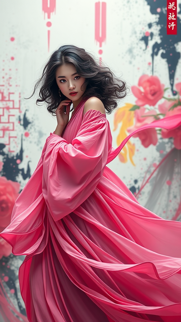 Erjie, a girl gracefully poised in a fluid motion, dressed in a loose, flowing pink gown, her expression mysterious and captivating, with curly black and pink hair, set against a modern and abstract backdrop. Bold and colorful abstract art surrounds her, with a blurred background enhancing the bright lighting. Depicted in a style reminiscent of official art, like a unity 8k wallpaper, she is adorned in intricate attire inspired by zhongfenghua, offering an extremely detailed appearance. The scene captures a dynamic angle, embodying the most beautiful form of chaos, blending elegance with brutalist design. Vivid colors and elements of romanticism are interwoven throughout, creating a masterpiece of visual intrigue.