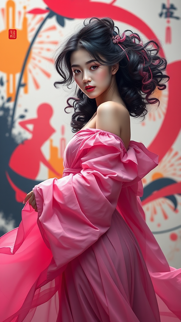 Erjie, a girl in a fluid and dynamic pose, sporting a loose, flowing pink dress, an enigmatic expression playing across her face, with her curly black and pink hair cascading gracefully. She's set against a modern and abstract backdrop, featuring bold and colorful abstract art with a softly blurred background and vibrant lighting. This is official art crafted for a Unity 8k wallpaper, showcasing intricate attire in the style of Zhongfenghua, with remarkable detail. Captured from a dynamic angle, embodying the most beautiful form of chaos with elegance, the scene echoes a brutalist design interspersed with vivid colors and touches of romanticism.