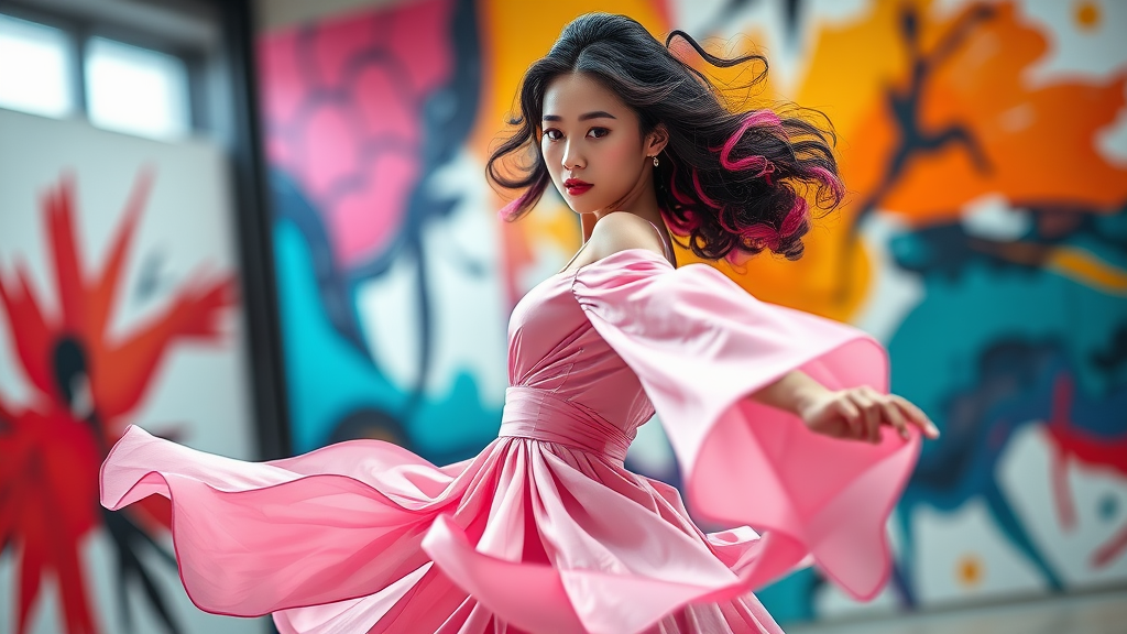 Erjie, a girl in a fluid and dynamic pose, wearing an elegantly flowing pink dress, with a mysterious expression and curly black and pink hair, set in a modern and abstract environment filled with bold and colorful abstract art. The blurred background and bright lighting enhance the scene, capturing the essence of official art in unity 8k quality. Her attire is intricately designed, echoing the style of zhongfenghua, with an emphasis on the highest level of detail. The image, taken from a dynamic angle, embodies the most beautiful form of chaos in a setting influenced by romanticism and brutalist design. The vivid colors and elaborate textures complement her elegance, creating a captivating and harmonious visual narrative.