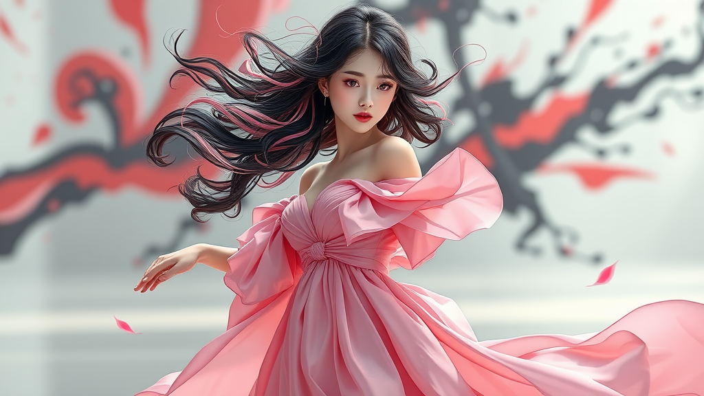 Erjie, a girl in a fluid and energetic pose, adorned in a loose, flowing pink gown, her expression enigmatic, her hair a swirl of black and rosy pink curls, set in a sleek and abstract environment, featuring bold, vibrant abstract artwork, with a softly blurred backdrop and luminous lighting, capturing an official art feel, unity 8k wallpaper quality, her attire intricately detailed, zhongfenghua-inspired, highly detailed, showcasing the ultimate detail, her surroundings a scene of dynamic angles and the most beautiful chaos, possessing elegance amidst brutalist design, painted with vivid colors, a touch of romanticism.