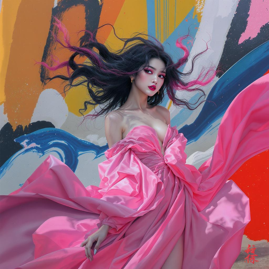 Erjie, a girl in a fluid, dynamic pose, wearing a loose, flowing pink dress, with a mysterious expression and curly black and pink hair, set in a modern, abstract backdrop featuring bold, colorful art and a subtly blurred background. The scene is brightly lit, resembling official art in Unity 8k wallpaper style, showcasing intricate clothing, inspired by Zhongfenghua. The image is extremely detailed, depicted from a dynamic angle to capture the most beautiful form of chaos, exuding elegance amidst a brutalist design, with vivid colors and a touch of romanticism.