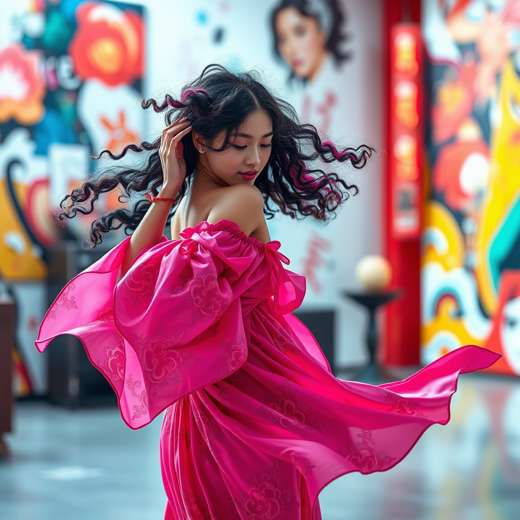 Erjie, a girl in a graceful yet dynamic pose, adorned in a loose, flowing, vibrant pink dress, exudes a mysterious aura. Her curly black and pink hair cascades around her, set against a modern and abstract environment filled with bold, colorful, and intricate art. The blurred background enhances the scene's bright lighting, capturing an essence of official artistry fit for a Unity 8k wallpaper. Her attire boasts intricate designs, reminiscent of zhongfenghua, with an exceptionally detailed finish. The dynamic angle showcases the most beautiful form of chaos, merging elegance with a touch of brutalist design, and infused with vivid colors, reflecting elements of romanticism.