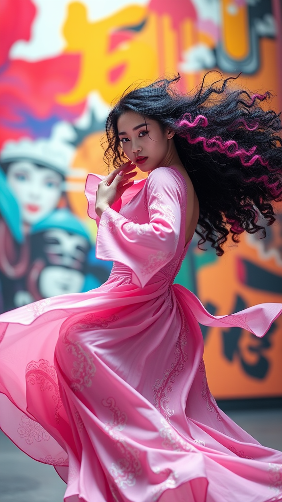 erjie, a girl in an energetic and dynamic pose, wearing a flowing pink dress with intricate detailing, exuding a mysterious aura, her curly black and pink hair cascading around her, set in a modern, abstract environment filled with bold, colorful art, a blurred yet vibrant background, illuminated by bright lighting, styled as official art in a unity 8k wallpaper format, the clothing reflecting zhongfenghua influences, showcasing extreme intricacy, captured from a dynamic angle, embodying the most beautiful form of chaos, elegantly juxtaposed with a brutalist design, infused with vivid colors and the essence of romanticism.