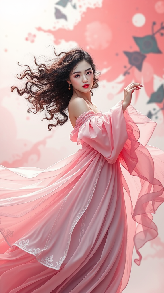 erjie, enchanting girl in a fluid and dynamic pose, adorned in a loose, flowing pastel pink gown, wearing a mystifying expression, her hair a captivating swirl of curly black and soft pink hues, set within a modern abstract environment, surrounded by bold and vibrant abstract art, background delicately blurred, illuminated with bright lighting, resembling official art, crafted as unity 8k wallpaper, featuring intricately detailed attire, inspired by zhongfenghua, incredibly detailed, with a dynamic angle, capturing the essence of exquisite chaos, elegance blended with a brutalist design, vivid colors inspired by romanticism.