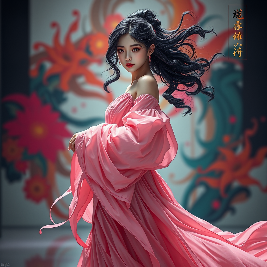 erjie, girl in an elegant and fluid stance, adorned in a flowing, loose pink gown, enigmatic expression, black and pink curls cascading, set against a modern, abstract scene with vivid and bold artistic elements, background softly blurred, illuminated with bright lighting, official artwork, unity 8k resolution, intricately detailed attire, inspired by zhongfenghua, exceptionally detailed, dynamic perspective, embodying the most beautiful chaos, graceful, brutalist-inspired design, vibrant hues, infused with romanticism.