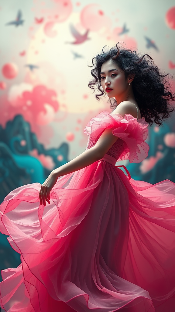 erjie in a free-flowing and dynamic pose, adorned in an airy pink dress, exuding a mysterious allure with her curly hair infused with black and pink hues, set against a modern abstract backdrop filled with bold, vibrant art. The scenery blurs softly with bright, illuminating light, creating an official art quality akin to unity 8k wallpaper. Her attire is intricately detailed, inspired by zhongfenghua, capturing the highest degree of detail. Positioned at a dynamic angle, she embodies the most exquisite form of chaos, merging elegance with a brutalist design characterized by vivid colors and romanticism.