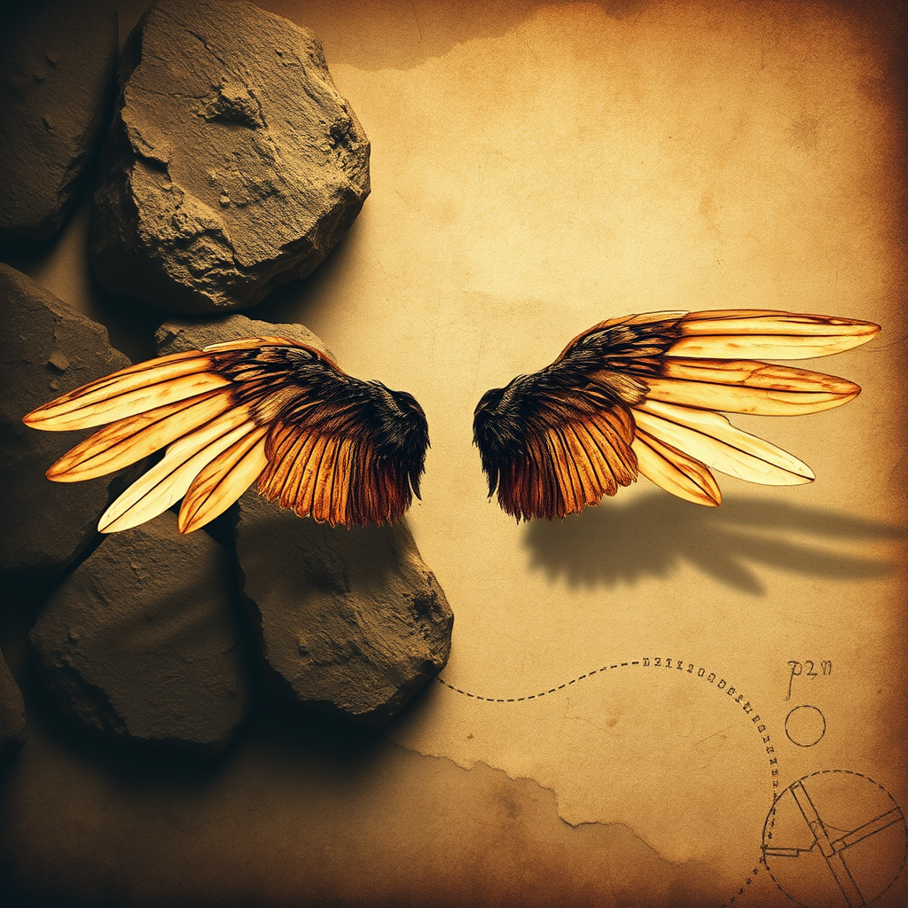Eroded temple stones in dark gold and beige hues, digitally enhanced for shadows and texture, juxtaposed with aged, sepia-toned, translucent wings in foreshortened perspective, as if in sweeping flight or the remnants of a bygone era, intricately layered over vintage creased parchment with white ink details echoing ancient mythology tattoo-inspired symbolisms.