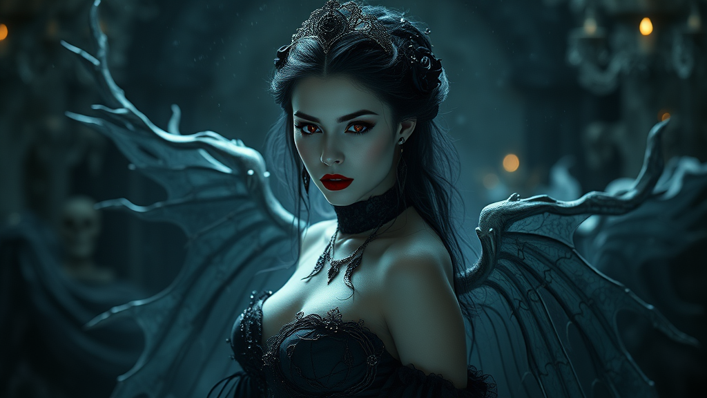 Ethereal and mesmerizing women with porcelain white skin, midnight sapphire hair, and striking scarlet eyes, embodying the allure and majesty of a vampiric queen. Enigmatic and seductive, she stands amidst a dark, gothic setting that exudes an eerie, morbid beauty. The scene envelops her in a heavy, atmospheric aura, dripping with moisture and rich textures, creating an epic, dramatic tableau. Her presence is captivating, a true femme fatale in a glamorous pose, exuding passion and intensity. The hyper-ornate details of her attire and surroundings are incredibly realistic, with maximum landscape depth captured in a full body shot. The photorealistic rendering is enhanced by volumetric lighting that casts an enchanting glow, capturing every nuance of the dramatic scene.