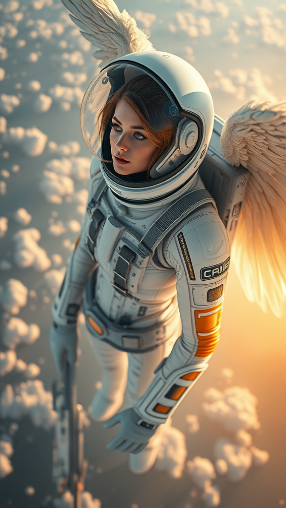 Ethereal angelic female figure in a celestial realm, captured in a satellite perspective, adorned in a futuristic spacesuit, intricately detailed in design. Above, the scene is imbued with epic cinematography, bathed in natural, golden light that elevates the photorealism. The composition is a masterpiece of high-quality imagery, rendered in 8K Ultra-HD with exceptional detail. The heavenly backdrop features an awe-inspiring interplay of light and shadow, creating a monumental photograph that blends otherworldly beauty with cinematic magnificence.