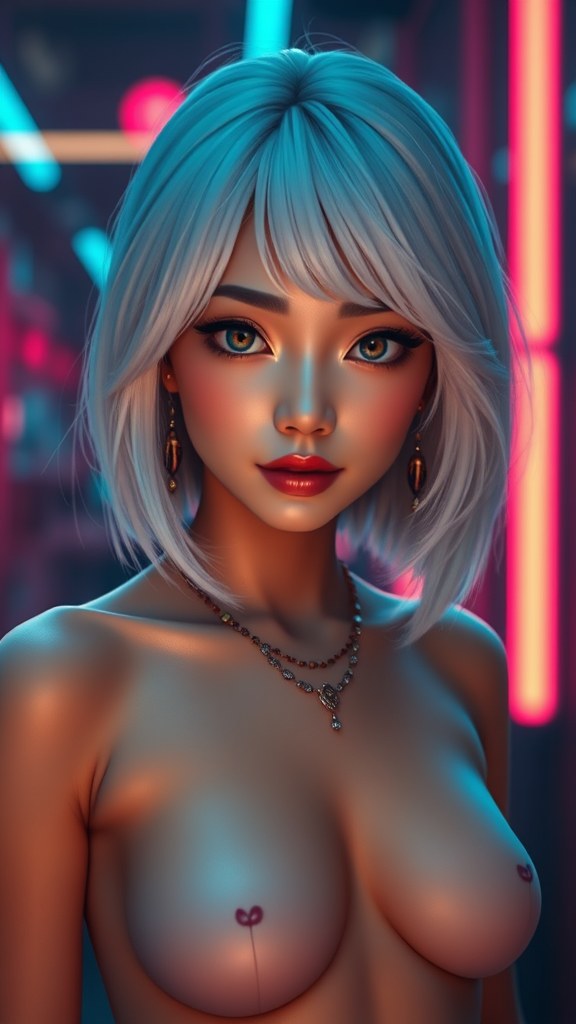 Ethereal Asian woman with striking white hair, captivating eyes, and glowing olive skin. Her medium-length hair frames a delicate, elegant face. She possesses a petite, toned physique, highlighting her midriff. Set against a mesmerizing neon light backdrop, the scene is illuminated with cinematic lighting, delivering a breathtaking 8k UHD experience. Her symmetrical eyes shine with photorealistic detail in a hyper-realistic photography style. Adorned with exquisite jewelry, the depiction is an intersection of CGI, 3D rendering, and digital art, combining cartoon and anime influences. The result is an extraordinary visual masterpiece, avoiding artifacts of low quality or errors in anatomy.