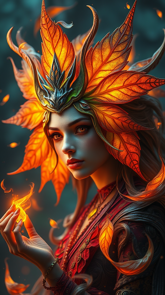 Ethereal autumn leaf deity, radiant flames, captivating, intricate character portrait, detailed, breathtaking, 8k resolution, dynamic lighting, hyper-detailed, quality 3D rendered, volumetric illumination, inspired by Greg Rutkowski, oil painting style, detailed backdrop, ArtStation character showcase, DnD character illustration, beauty, elegance, passion, vivid colors, harmonious balance, mesmerizing focus, enchanting atmosphere, intricate craftsmanship, imaginative artistry, vibrant composition, stunning realism, timeless beauty.