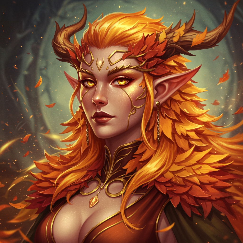 Ethereal autumn leaves deity, celestial fire, epic and intricate character portrait with captivating beauty, 8k resolution, dynamic and hyperdetailed lighting, high-quality 3D-rendered, volumetric lighting inspired by Greg Rutkowski, oil painting on canvas, detailed background, ArtStation character portrait, D&D character creation, vivid and rich colors, focused composition, harmonious anatomy, masterfully crafted features, balanced proportions, expressive and elegant design, enchanting and mythical essence.