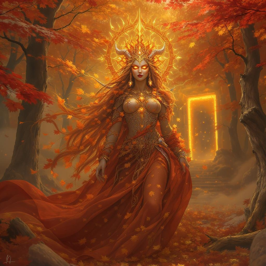 Ethereal autumn leaves deity, radiant fire, epic scene, intricate character portrait, exquisite, 8k resolution, dynamic and volumetric lighting, hyperdetailed, high-quality 3D rendering, inspired by Greg Rutkowski, oil painting style, detailed background, artstation-worthy character portrait, fantasy-themed, enchanting, intricate artistry, natural beauty, captivating essence, seamlessly blended colors, vivid imagination, and stunning visual depth.