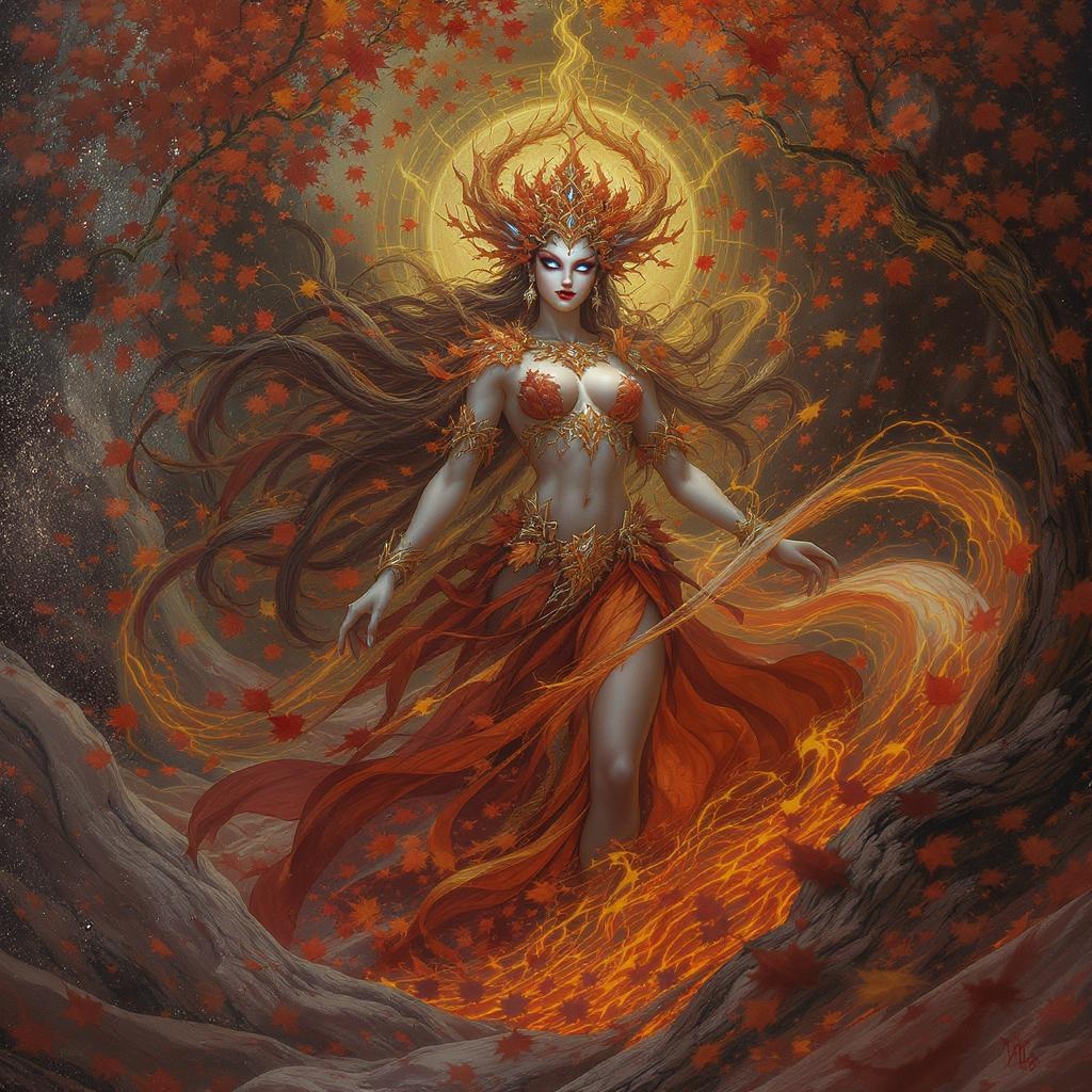 Ethereal autumn leaves deity, surrounded by ethereal fire, captured in an epic and intricate character portrait. The scene is beautifully rendered in 8k resolution with dynamic, hyper-detailed lighting and volumetric effects. The artwork echoes the style of Greg Rutkowski, showcasing an oil on canvas aesthetic with a meticulously detailed background. Designed for an ArtStation character portrait, this image draws inspiration from DnD character design. The deity stands amidst swirling leaves and flames, embodying elegance and mythical splendor. Elements of bad art and anatomy have been subtly transformed into an intricate, colorful, and enchanting portrayal, devoid of the earlier imperfections.
