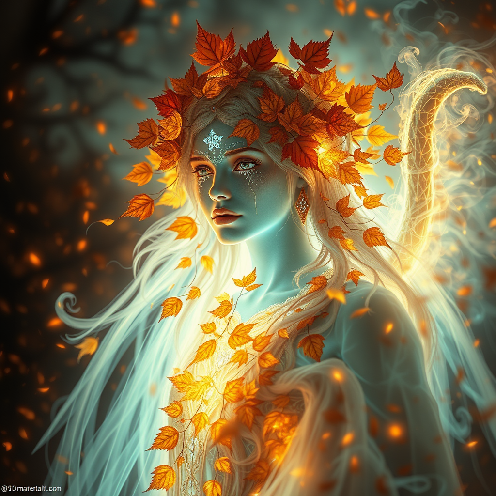 Ethereal autumn leaves deity with a mystical aura, surrounded by an ethereal fire, creating an epic and intricate portrait. The character is beautifully rendered in a hyper-detailed 3D style, with dynamic and volumetric lighting capturing every detail. Inspired by the artistry of Greg Rutkowski, the scene resembles an oil on canvas piece with a richly detailed background. This fantastical portrait showcases the elegance and complexity of a D&D character, highlighting a serene and powerful presence against the backdrop of swirling leaves and glowing embers. The overall composition is polished and artistic, free from imperfections or distortions, presenting the character in an awe-inspiring and visually captivating manner.