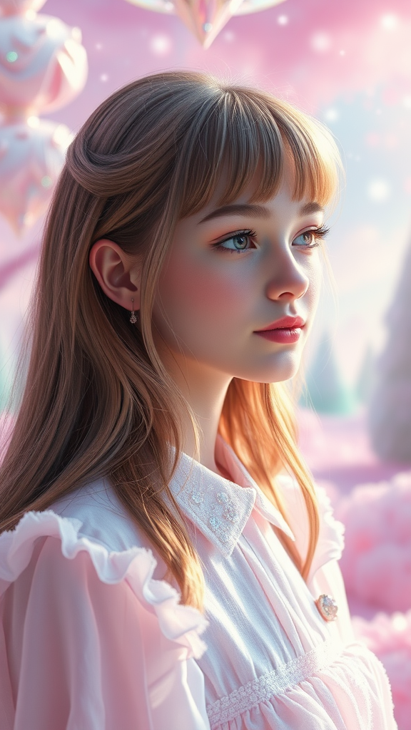 Ethereal candy land Disney-inspired world with a soft, fluffy landscape, reminiscent of a whimsical forest with touches of snow. Pastel pink sky harmonizes with hues of green and blue, shimmering with ethereal light, creating a magical ambiance of sparkle and stars. Imagery of diamonds and gemstones adds to the magical allure, while a hyper-realistic, cinematic lighting casts an immense detail across the scene. In focus is a well-lit, fantastical portrait of a girl with real skin, featuring long, flowing hair with blunt bangs, and a collared dress. The scene is a masterpiece in full HD quality, capturing the whimsical essence with pastel light, rainbow accents, and a serene yet vibrant background.