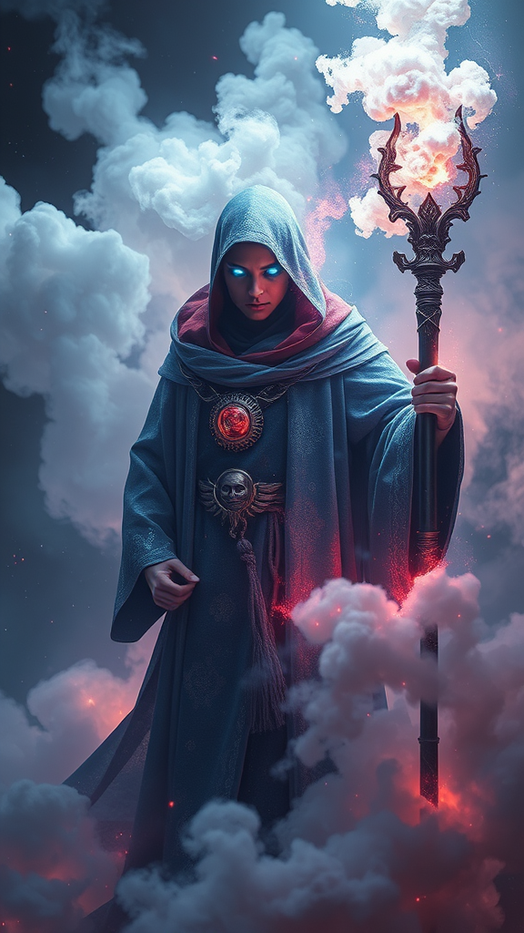 Ethereal cosmic sorcerer shrouded in swirling mist and smoke, depicted in a photorealistic style with unreal detail, octane render techniques highlighting volumetric fog and ethereal lights, vibrant hues illuminating the scene, hyper-detailed robes adorned with stardust patterns, eyes like nebulae glowing with mystical energy, a staff crackling with celestial power, surrounded by a dynamic dance of colors and shadows reflecting the infinite mysteries of the universe.