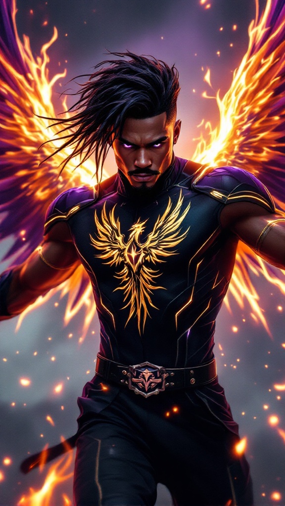 Ethereal cosmic superhero, majestic African-American male figure, 8k ultra-detailed portrait, muscular athletic build. Dynamic fade hairstyle with obsidian waves, undercut sides, cascading front locks draping dramatically over one eye while defying gravity with ethereal flame effects, golden-orange fire wisps emanating from hair. Mesmerizing violet-amethyst eyes with luminous stellar glow, dramatic kohl eyeliner emphasizing cheekbones and sculpted features, soul patch beneath full glossy lips, precise thin handlebar mustache.Snug fitting dark violet jumpsuit with metallic chrome yellow-gold piping creating dramatic light trails, cyberpunk aesthetics, loose dramatic folds. Prominent metallic gold phoenix emblem on chest, wings spread majestically, intricate detail work. Black leather fingerless gloves with reinforced knuckles, wide black leather belt with polished gold grommets. Pleated tapered pants with neo-Tokyo streetwear influence, distressed black suede boots with decorative gold-grommet straps. Dynamic flying pose with arms extended, massive flaming incandescent golden phoenix wings emerging from arms, trailing cosmic fire. Backlit by nebulae and spiral galaxies, dramatic rim lighting, volumetric space dust, lens flares from distant stars. Cinematic composition, dramatic angle, octane render, hyperrealistic detail, ethereal atmospheric lighting, cosmic energy effects.