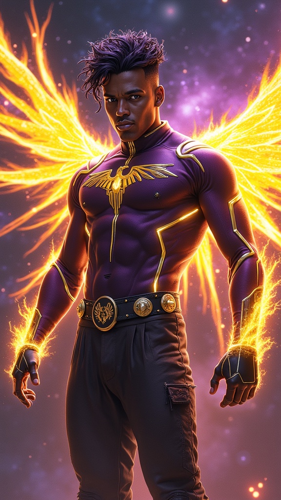 Ethereal cosmic superhero, majestic African-American male figure, 8k ultra-detailed portrait, muscular athletic build. Dynamic fade hairstyle with obsidian waves, undercut sides, short in back and sides, curly front locks swept over draping dramatically over one eye while defying gravity with ethereal flame effects, golden-orange fire wisps emanating from hair. Mesmerizing pale violet-amethyst eyes with luminous stellar glow, dramatic kohl eyeliner emphasizing smooth cheekbones and sculpted features, soul patch beneath full glossy lips, precise thin handlebar mustache. Snug fitting long-sleeved dark violet/eggplan-colored jumpsuit with metallic chrome yellow-gold piping creating dramatic light trails, cyberpunk aesthetics, loose dramatic folds. Prominent metallic gold phoenix emblem on chest, wings spread majestically, intricate detail work. Black leather fingerless gloves with reinforced knuckles, wide black leather belt with polished gold grommets. Pleated tapered pants with neo-Tokyo streetwear influence, distressed black suede boots with decorative gold-grommet straps. Dynamic flying pose with arms extended, massive flaming incandescent golden phoenix wings emerging from arms, trailing cosmic fire. Backlit by nebulae and spiral galaxies, dramatic rim lighting, volumetric space dust, lens flares from distant stars. Cinematic composition, dramatic angle, octane render, hyperrealistic detail, ethereal atmospheric lighting, cosmic energy effects.