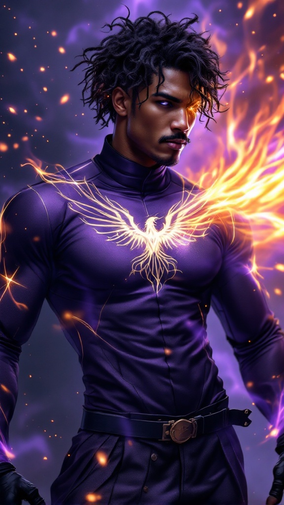 Ethereal cosmic superhero, majestic African-American male figure, 8k ultra-detailed portrait, muscular athletic build. Dynamic fade hairstyle with obsidian waves, undercut sides, short in back and sides, curly front locks swept over draping dramatically over one eye while defying gravity with ethereal flame effects, golden-orange fire wisps emanating from hair. Mesmerizing pale violet-amethyst eyes with luminous stellar glow, dramatic kohl eyeliner emphasizing smooth cheekbones and sculpted features, soul patch beneath full glossy lips, precise thin handlebar mustache. Snug fitting long-sleeved dark violet/eggplan-colored jumpsuit with metallic chrome yellow-gold piping creating dramatic light trails, cyberpunk aesthetics, loose dramatic folds. Prominent metallic gold phoenix emblem on chest, wings spread majestically, intricate detail work. Black leather fingerless gloves with reinforced knuckles, wide black leather belt with polished gold grommets. Pleated tapered pants with neo-Tokyo streetwear influence, distressed black suede boots with decorative gold-grommet straps. Dynamic flying pose with arms extended, massive flaming incandescent golden phoenix wings emerging from arms, trailing cosmic fire. Backlit by nebulae and spiral galaxies, dramatic rim lighting, volumetric space dust, lens flares from distant stars. Cinematic composition, dramatic angle, octane render, hyperrealistic detail, ethereal atmospheric lighting, cosmic energy effects.