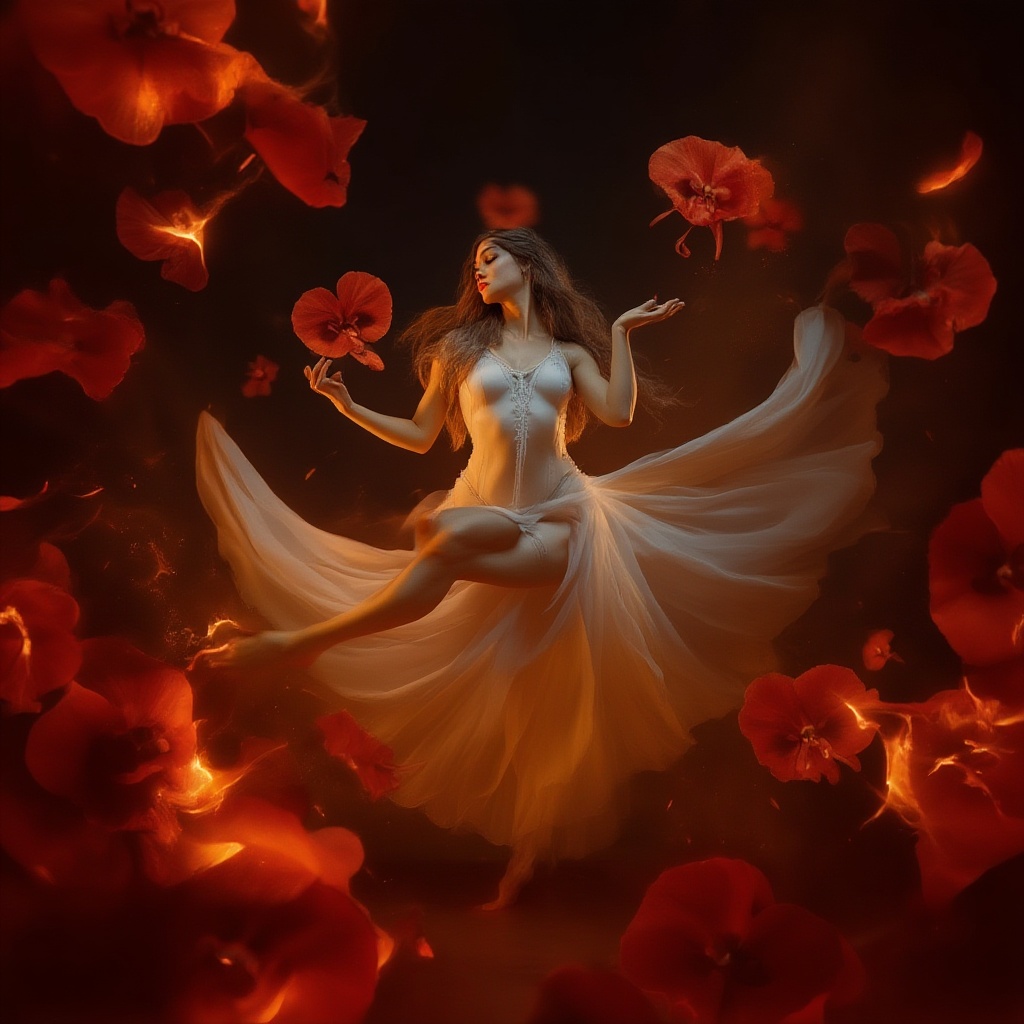 Ethereal dancer captured in a triple exposure photograph, gracefully moving in flowing fabrics, surrounded by large, fiery orchid petals that flicker like flames, cinematic composition enhanced with dynamic motion blur, 8k DSLR quality, evoking a dreamlike and mesmerizing atmosphere.