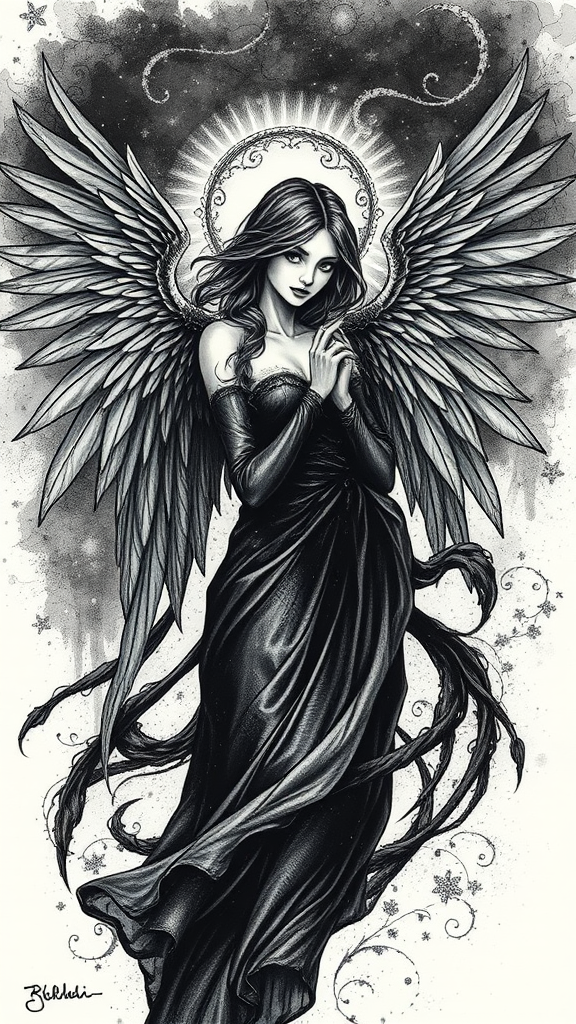 Ethereal dark angel maiden, intricate ballpoint pen illustration, with flowing shadowy wings and a gaze of mysterious allure, enveloped in a midnight aura with delicate, swirling patterns in the background, capturing a blend of elegance and enigma.