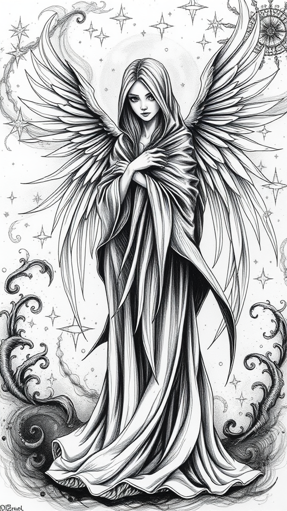 Ethereal dark angel woman in a flowing cloak, drawn in intricate ballpoint pen strokes, her eyes enigmatic and wings elegantly folded behind her, standing amidst swirling shadows and cosmic stars.