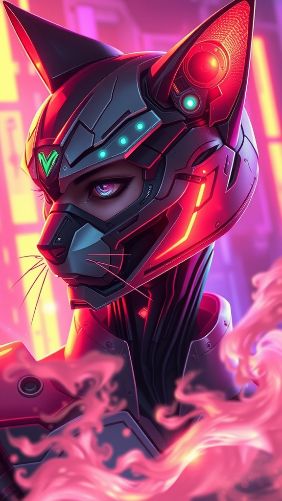 Ethereal digital painting, anime-inspired portrait of a futuristic military cyborg with cyberpunk aesthetics, features a sleek armored cat-like design, exuding stealth within a warframe context, surrounded by vibrant neon lights and swirling smoke. The character boasts a meticulously detailed face, showcasing intricate symmetrical design, enhanced by volumetric and ambient lighting. The art displays real-time VFX quality with UHD HDR 3D effects, capturing a side profile that highlights subtle facial expressions including the mouth and ears. Despite occasional artistic imperfections like slight blurriness and distorted anatomy, the piece is strikingly unique with its elongated neck and partially cropped head, presenting an avant-garde interpretation.