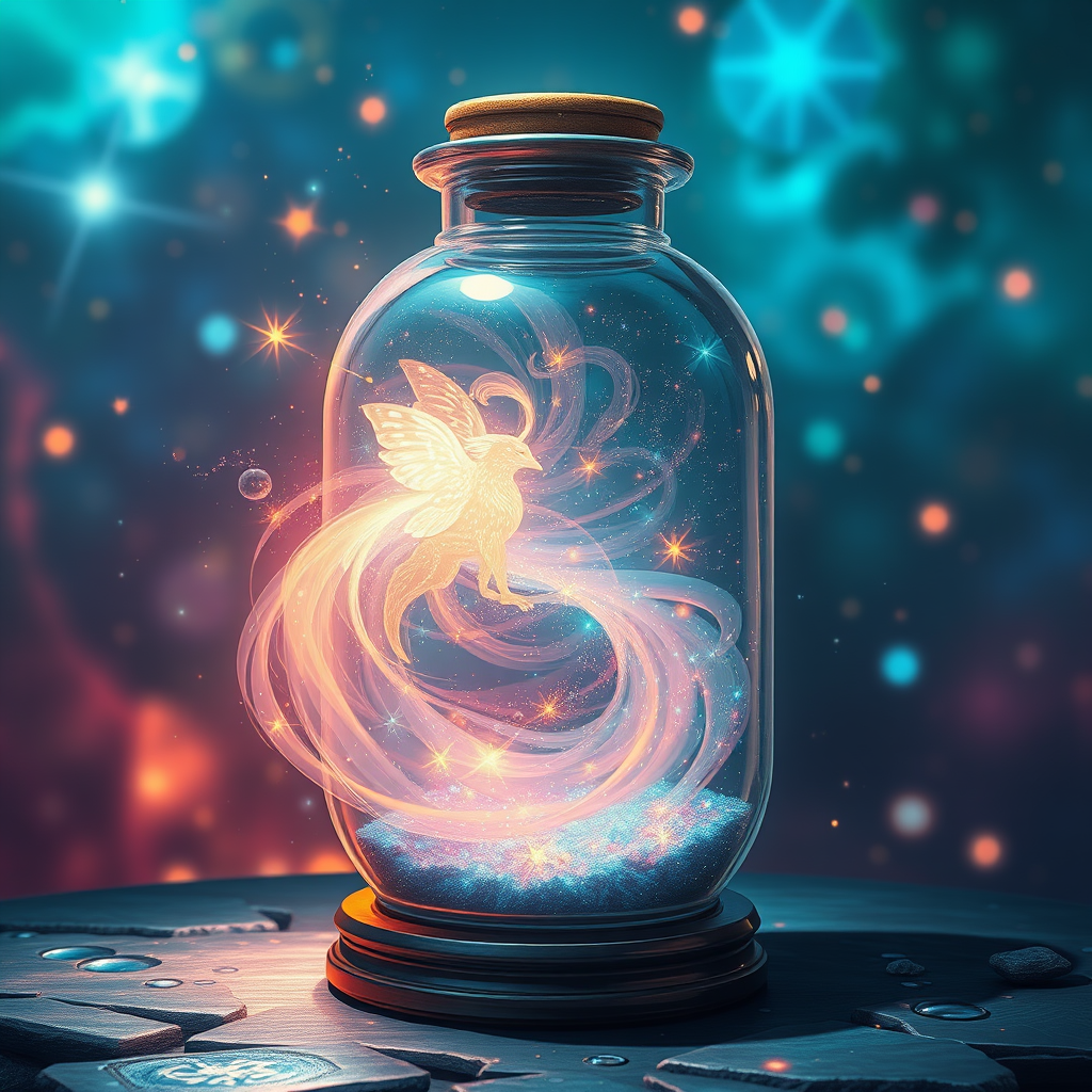 Ethereal divine faerie dust swirling in a crystal vial, exuding enchanting cosmic energy, a masterpiece of highly detailed painting with rich, vibrant hues and fantasy-inspired intricacies; blending complementary colors for a striking composition. This concept art captures the magic of a surreal world and trends on Artstation, with stylistic cues from Unreal Engine 5. Drawing inspiration from anime aesthetics, reminiscent of Japanese Manga, Pixiv, and Zerochan, the artwork presents a fantastical, hyperrealistic splash of imaginative depth. Featuring a mid-shot perspective with a 2/3 face angle caught in dramatic side lighting, the scene boasts a colorful, dynamic background that resonates with the essence of SAI Pixel Art.