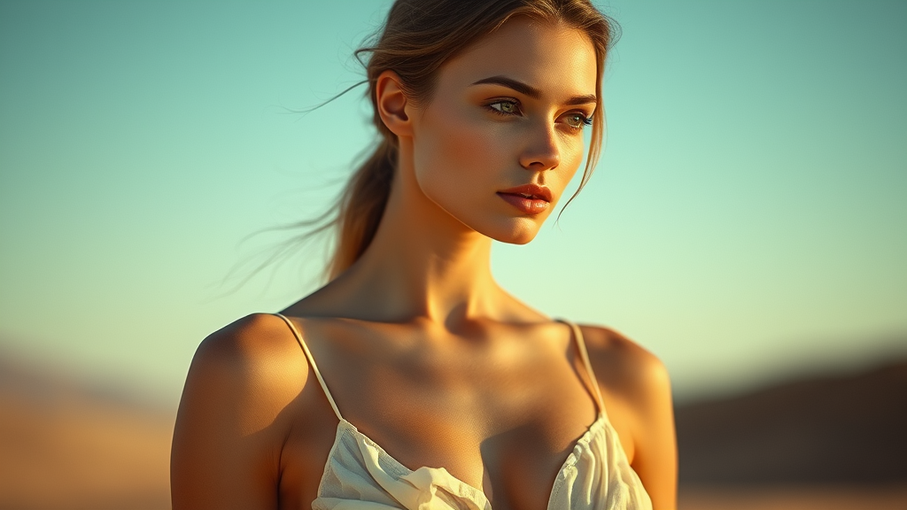 Ethereal Dreamscape: A tranquil fashion photograph features a statuesque female model, inspired by the serene works of Mario Testino. Standing tall in an exquisite, ultralight design dress with flowing silhouettes, she exudes effortless elegance. Soft, golden light wraps around her slender, athletic physique, accentuating her toned muscles. The delicate lines of her face and neck are amplified in a detailed, close-up shot, showcasing an otherworldly beauty. Her captivating eyes, shining bright with an inner serenity, seem to transcend the mortal realm. The overall mood is one of tranquility, as if time itself has slowed, and all that remains is the pure essence of this modern goddess.