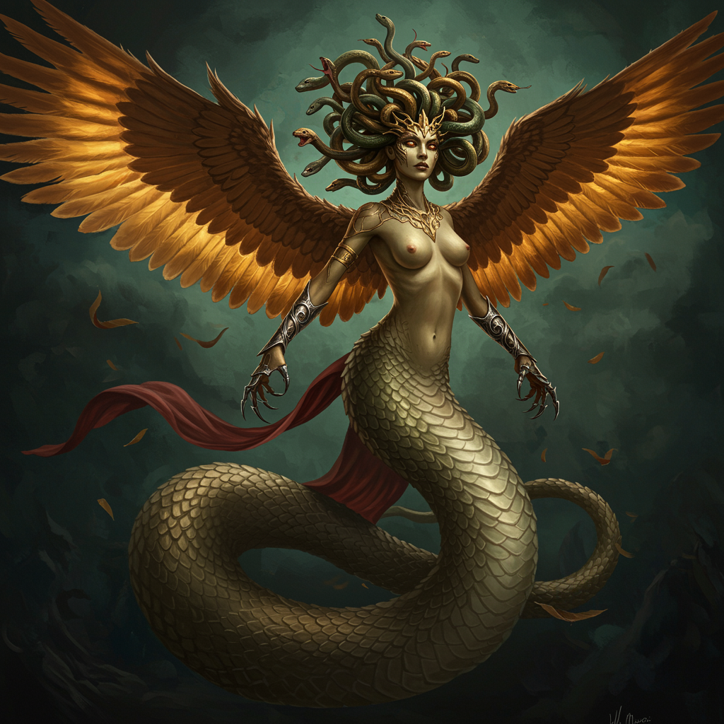Ethereal enchanting Gorgon gliding on a serpentine tail, her hair comprised of lively serpents, her flawless hourglass physique enveloped in iridescent scales, bronzed hands armed with gleaming steel talons, majestic wings adorned with luminous golden feathers. Realistic, with vivid brushstrokes, expressing intricate textures and an exquisite portrayal of nature, employing a dark fantasy palette. Embracing a Dark Aesthetic in oil paint on a high-quality canvas, this limited edition piece is reminiscent of an award-winning masterpiece, adhering to the principles of the golden ratio, with a multidimensional allure. Imagined by the artistry of Will Murai.