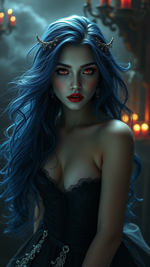 Ethereal, enchanting women with luminous alabaster skin and flowing midnight blue hair, eyes a mesmerizing crimson red. She exudes charm and allure, a regal vampiress with a dark, gothic allure. Enveloped in a morbid yet captivating ambiance, the scene is atmospheric and dense with a sense of intricate ornateness. Her full body is captured in a photorealistic glamour shot, emphasizing her femme fatale allure with an epic, dramatic flair. The surroundings are richly detailed, with dynamic volumetric lighting enhancing the mood. It's an incredibly realistic, octane-rendered portrait of passion and intensity, set against a maximum-detail landscape that adds to the scene's creepy, yet fascinating essence.