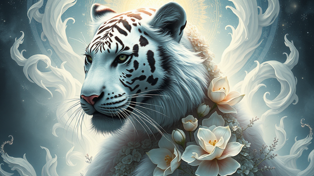 Ethereal fantasy portrait of a majestic white tigress adorned in an exquisite gown interwoven with delicate flowers, embodying spirituality and grace. The ultrarealistic digital painting captures her enigmatic presence with hyper-detailed brushwork and soft, celestial lighting. Inspired by the fusion of artistic styles from Anna Dittman, Alberto Seveso, Ruan Jia, Rossdraws, Artgerm, Greg Rutkowski, Alphonse Mucha, Loish, and WLOP, the scene conveys a fantasycore aesthetic with intricate textures. Set against a mystical backdrop, the composition evokes a sense of wonder and majesty, capturing the essence of a fantastical masterpiece ideal for Artstation showcase.