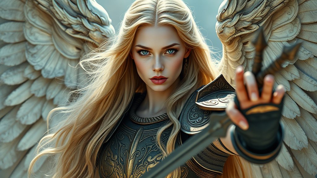 Ethereal female warrior archangel, haunting beauty with long golden hair, alabaster skin, piercing azure eyes, perfectly symmetrical and delicate features, ethereal and refined visage, armored celestial wings, adorned in bronze plate armor with intricate silver pauldrons, exuding elegance, engaging in a dynamic full body pose that evokes fantasy and D&D realms, envisioned in photorealistic splendor, with ultra-fine details and cinematic depth, rendered in 8k hyper-detail, bringing the majestic and otherworldly to life.