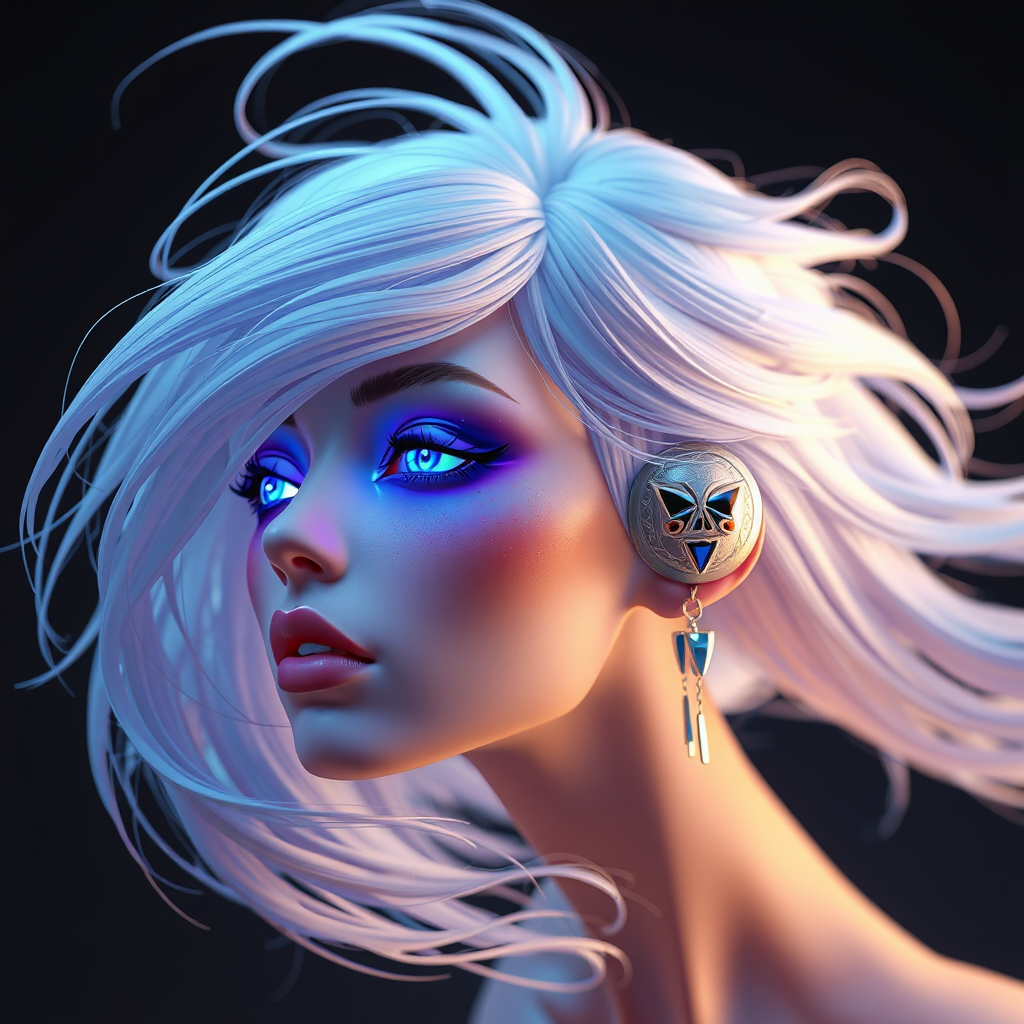 Ethereal figure with flowing hair and metallic silver accessories, floating gracefully at a dynamic angle. The figure's glowing blue-purple gradient eyes are striking against the high-resolution backdrop. Designed in a 3D art style reminiscent of Unreal Engine 5, the composition features clear lines and meticulously crafted facial features. Unique accessories add a touch of futuristic elegance to the scene.