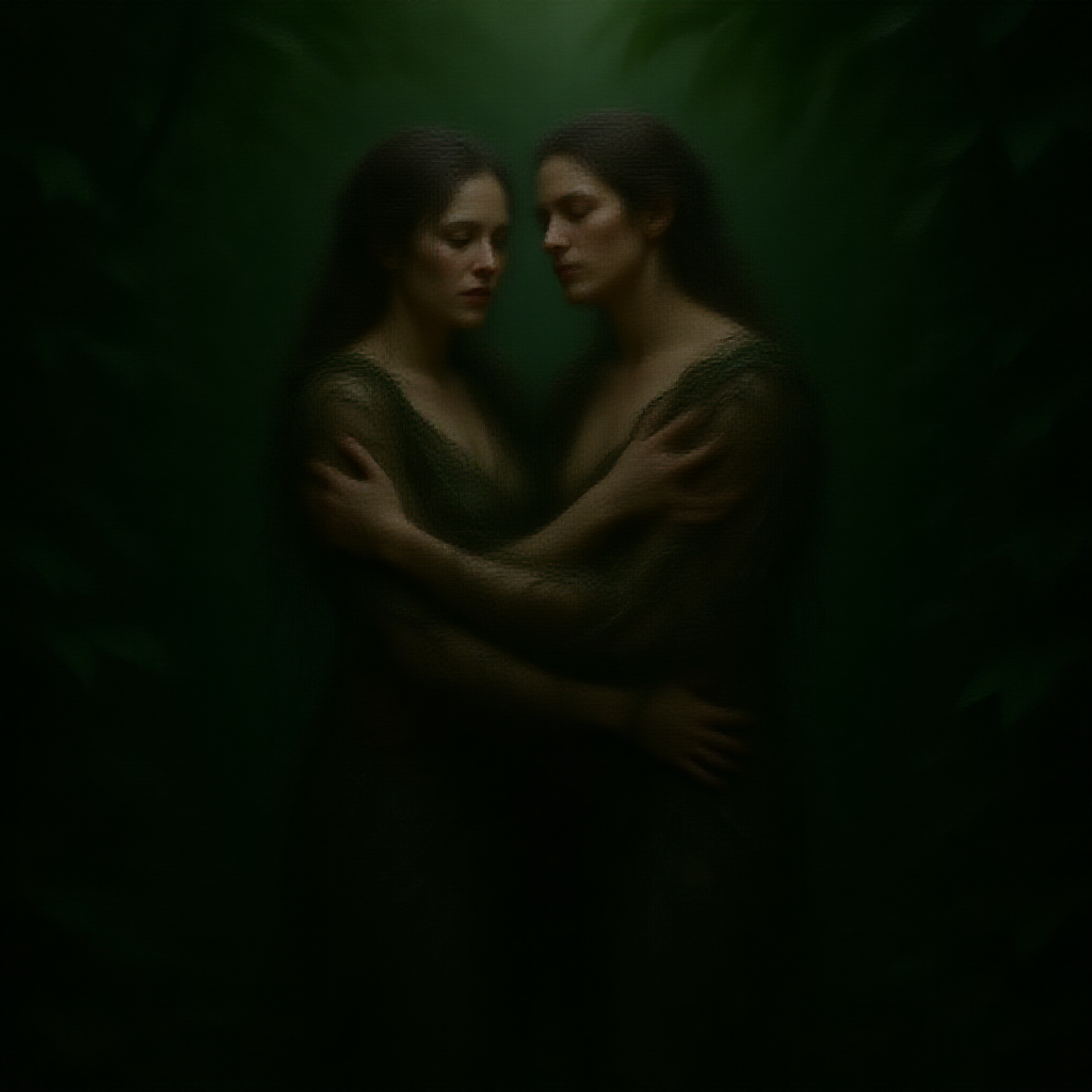 Ethereal figures intertwined in a heartfelt embrace, their bodies elegantly formed from lush, intertwining vines, standing amidst the dense jungle under a canopy of rich, verdant foliage. Their detailed facial features exude deep emotion, crafted with earthcore textures, while subtle firecore hues dance along their forms, creating a contrast of warmth amidst the surrounding darkness. The scene is rendered with physically based precision, capturing the intricate details of every leaf and tendril, the figures standing tall in a portrait orientation, with a stylization that imparts a dreamlike quality.