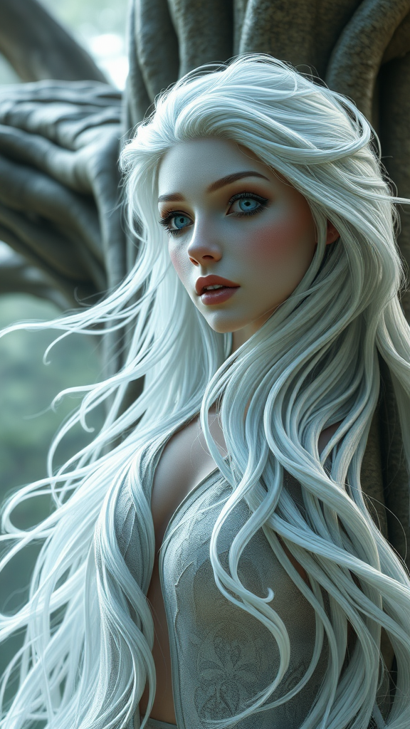 Ethereal forest goddess with flowing silver hair, alabaster skin, set against the backdrop of a colossal ancient tree, crafted by MountainDog Studios. Her facial features are intricately detailed, designed in a character sheet style, akin to clip art with a 3D render approach. Utilizing digital 3D techniques and Unreal Engine, the scene is infused with VFX and cinematic lighting. The presentation is isometric with a low-poly aesthetic, expertly created in Blender for an ultra-realistic, 8k photorealistic cinematic experience -- aspect ratio 2:3 -- high stylization -- artistic chaos -- quality level 2.