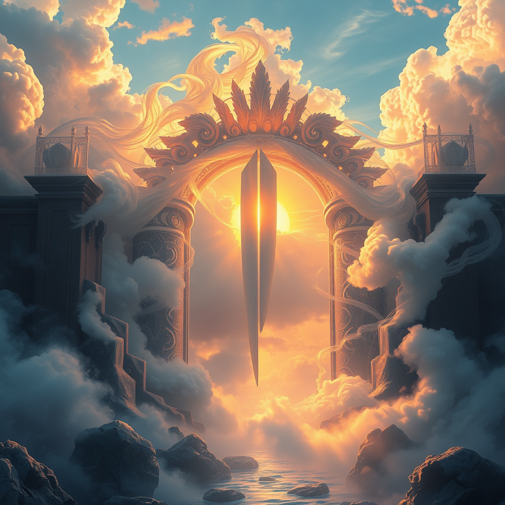 Ethereal gates to paradise, 4k, intricately detailed, swirling vapors of heavenly essence, imbued with ix crystal opulence reminiscent of ivan aivazovsky 's majestic seascapes, sublimely rendered in the style of peter mohrbacher 's mystical realism, illuminated with radiant volumetric light akin to greg rutkowski 's ethereal visions, the masterful fusion of fantasy and realism, evoking an otherworldly aura reminiscent of unsolved mysteries, premium quality, available in independent artist prints, arrested in motion, delicately perceived rays of sunset falter beneath the sublime gates as cloudy drapery flows, gleaming bladed entry revolves majestically within infinite place