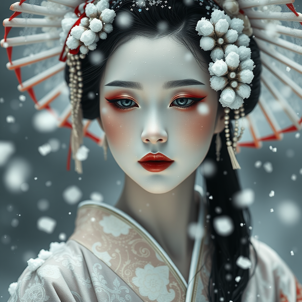 Ethereal Geisha amidst falling snow, alabaster skin, intricate and elegant design, exceptionally detailed, popular on art platforms, inspired by Tom Bagshaw and Seb McKinnon, ultra-realistic, cinematic presence, dramatic and volumetric lighting, captured in 150mm lens effect, octane-render like quality, lifelike and denoised, resembles a Hasselblad H3DII photograph, cgi-like detail, 3d doll-like appearance, avoiding anatomical errors, with graceful and accurate features, fully framed with a single, serene visage.