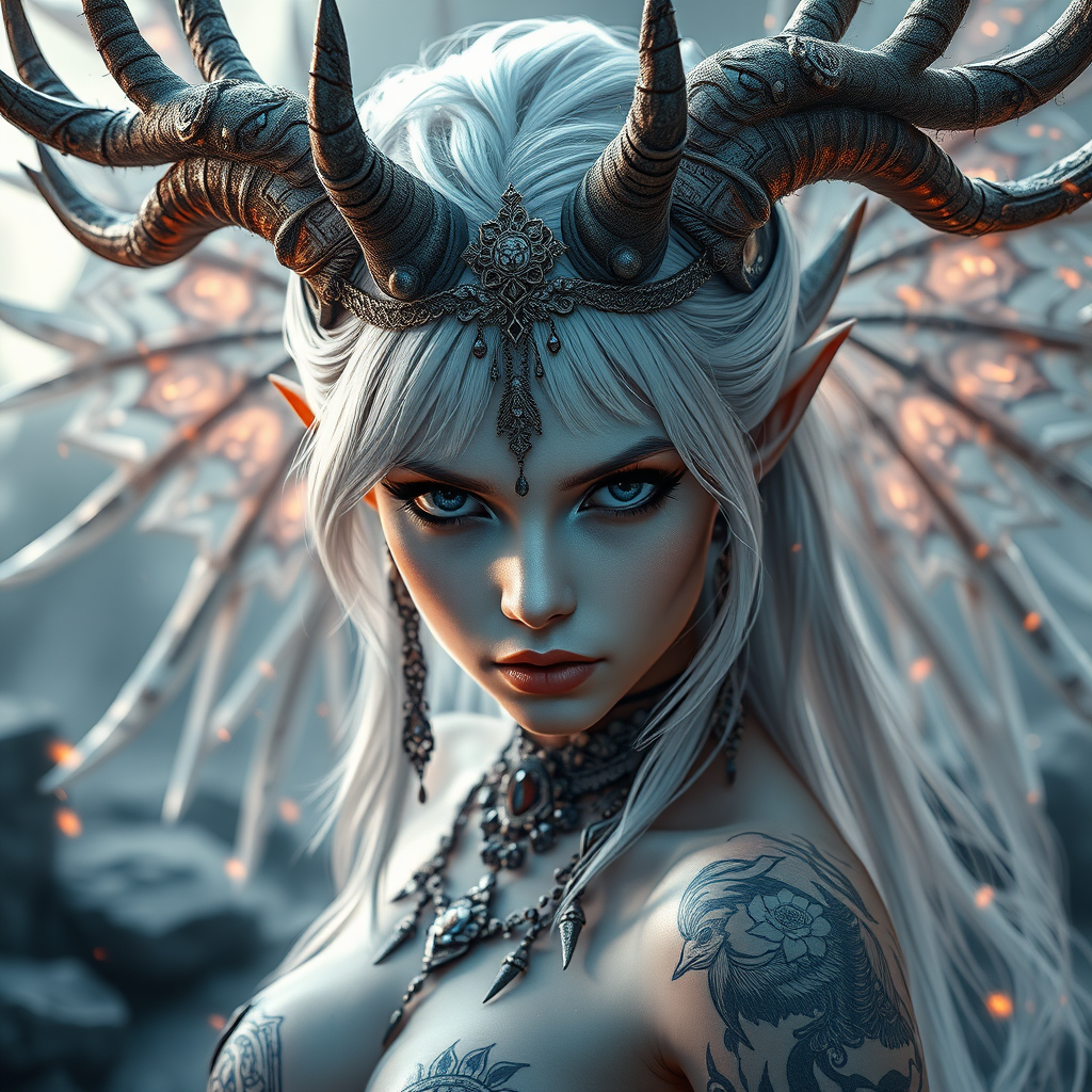 Ethereal girl, captivating, alluring, enigmatic, celestial being, antlered, radiant aura, silvery hair, alabaster complexion, intense, fierce, demoness, elaborate tattoos, adornments, exquisite jewelry, high-resolution, shimmering lights, hypnotic gaze, expressive eyes, captured moment, fiery sparks, cascading foliage, otherworldly, creative depiction, elaborate, photographic, modeling, soft volumetric lighting, mystical, game avatar, lifelike, breathtaking scenery, ancient ruins, inspired by Sophie Anderson and Artgerm, surreal elements, portraiture, digital character, haunting beauty.