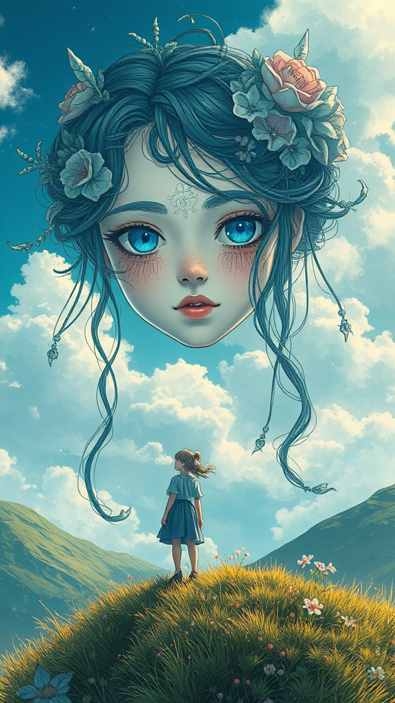 Ethereal girl | poised on a hillside | perfectly centered | stunningly detailed face | anime-inspired | visual centerpiece | exquisite intricacy | exceptionally detailed | mesmerizing | vivid | expansive | filmic | Carne Griffiths influence | Conrad Roset vibes | Studio Ghibli essence.